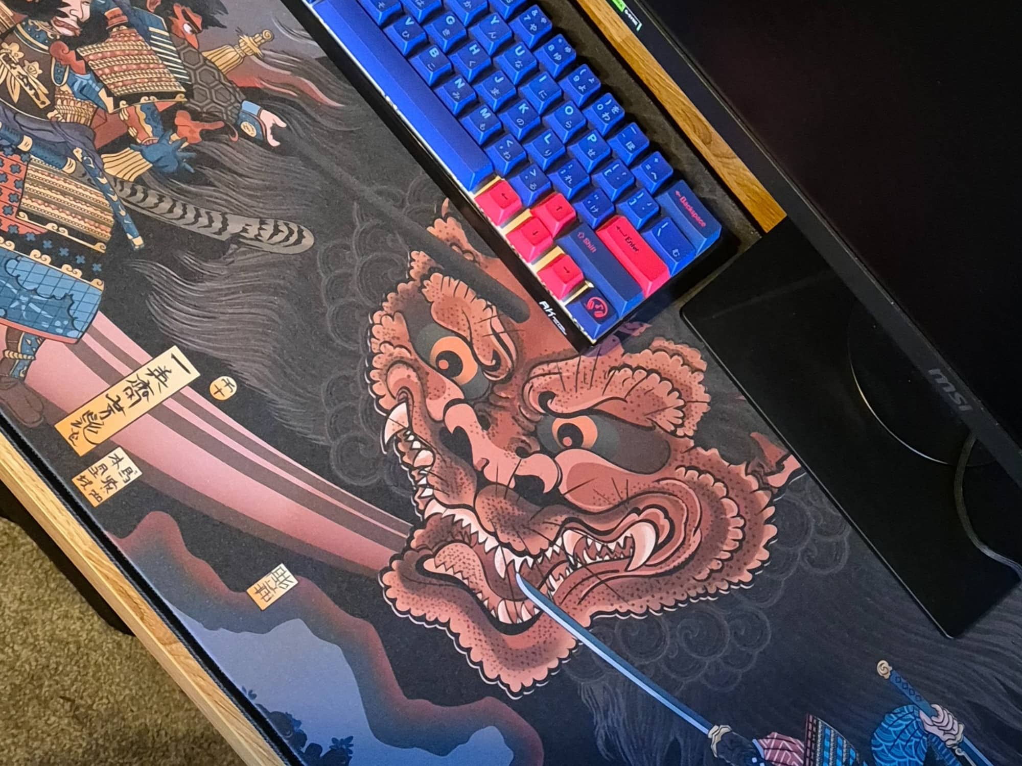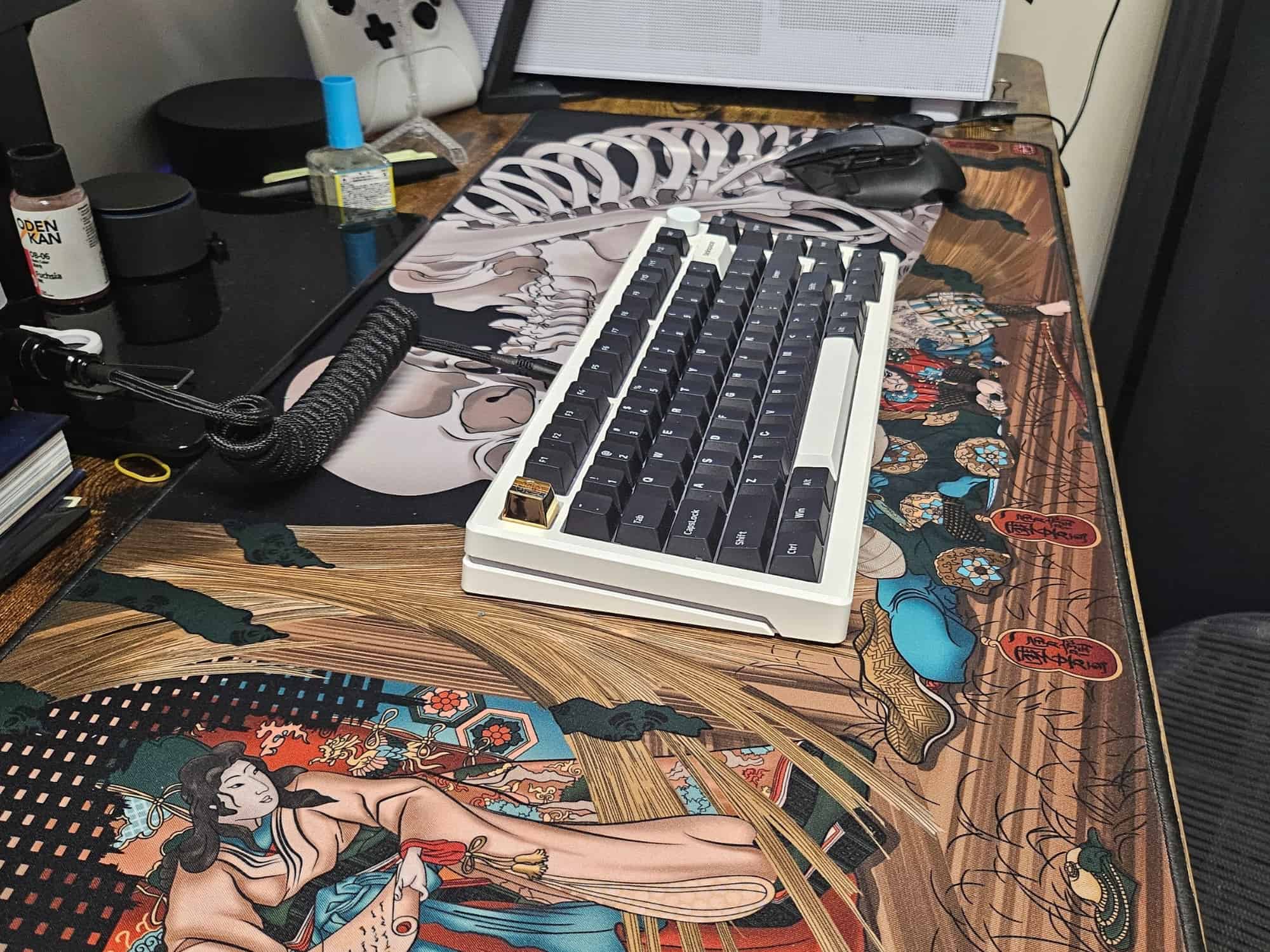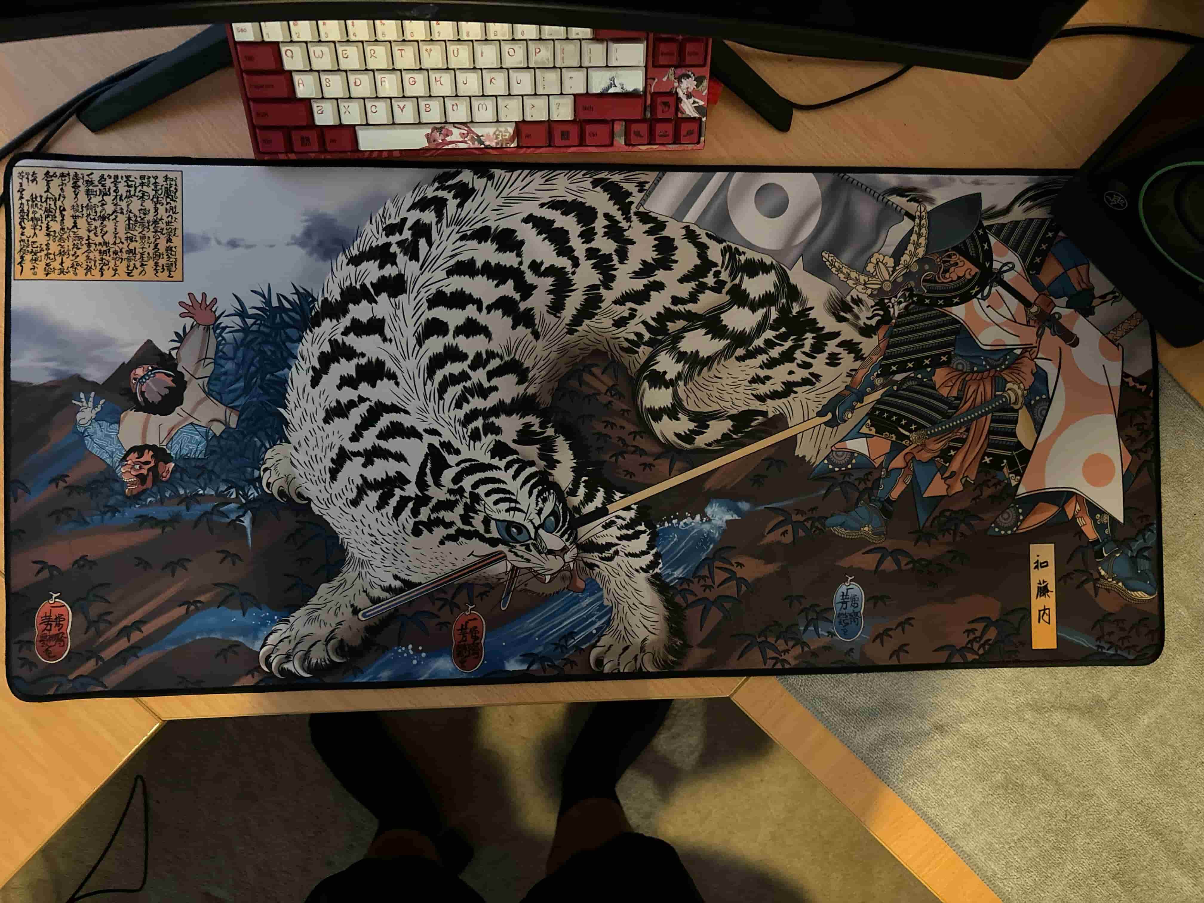 "The deskmat is really sleek and has a high quality print. It's really smooth on the surface and has a rubber bottom, which avoids it sliding from side to side. The stitches are made perfectly as well. Moreover, the brass keycap included is perfect on my white keyboard! I am loving my first Japanese designed mousepad!"